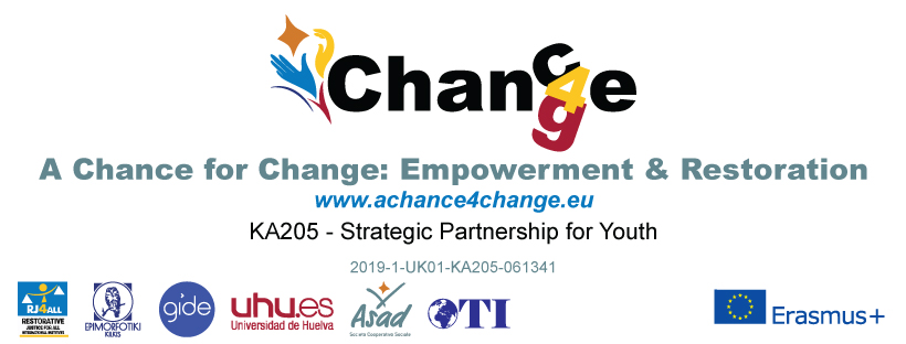 YOUTH: Promoting engaging, connecting and empowering young people As a youth-led project, CHANCE will directly empower young people in the participating countries to get involved in the project through volunteering and social action. The young people will be empowered to deliver project management (e.g. quality control) and project tasks. We will use the values of restorative justice (i.e. power-sharing, equality and fairness) to empower them to drive the project. While doing so, C4C will create and pilot an innovative model and related tools for youth workers empowering them to better connect and support their young people in their work in reducing GBV.